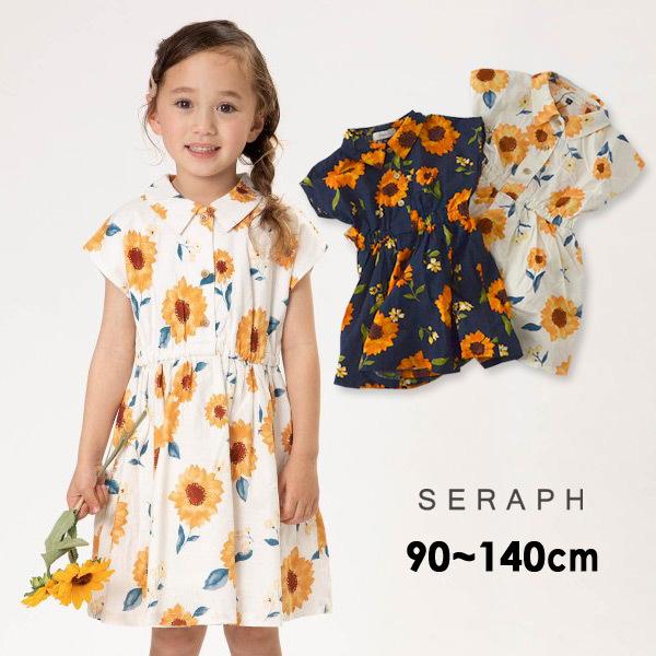 メール便可 セラフ s217261 m12m14 ひまわり柄半袖シャツワンピース キッズ ベビー トップス 半そで 総柄 花柄 女の子 子供服 seraph 4023833