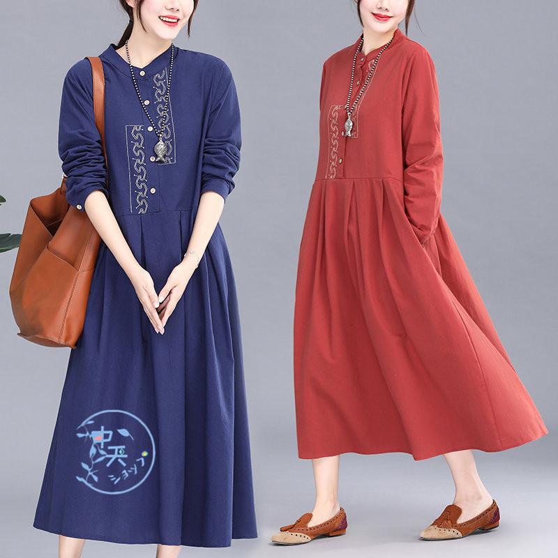綿麻 ワンピース 刺繍 花柄 長袖 文芸ゆるワンピース 大きいサイズ ロング丈ワンピース レディース