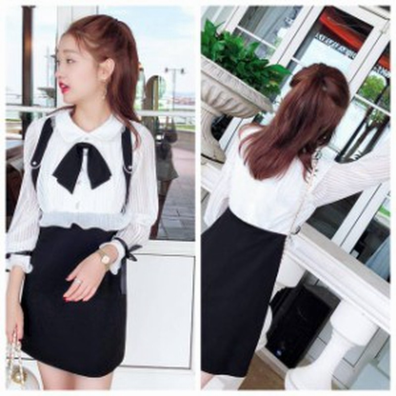 韓国 オルチャン ワンピース レディース リボンワンピース 半袖ワンピース モノトーン 膝上丈 ニット 秋冬 au pay マーケット