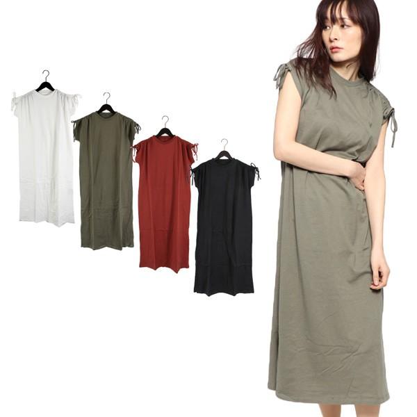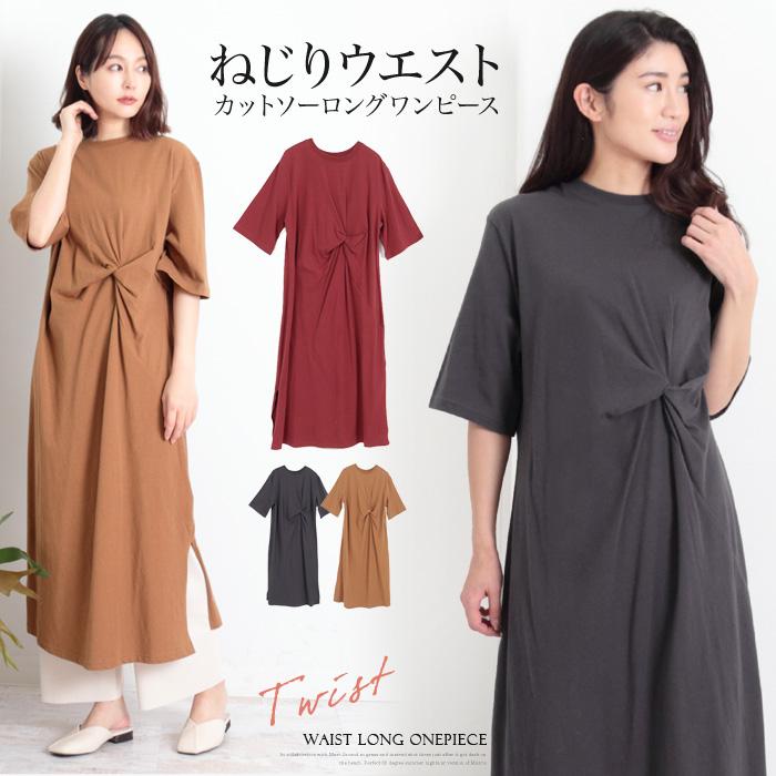 ワンピース 半袖 カットソー ワンピ クルーネック 丸首 ドロストショルダー リボン スリット ロング ロングワンピース レディース
