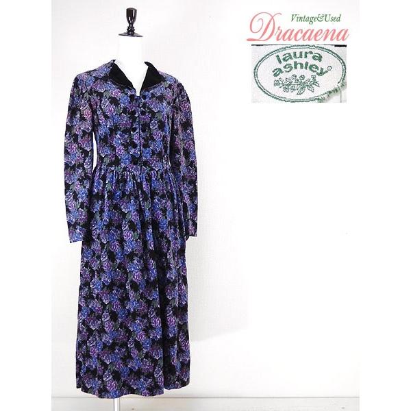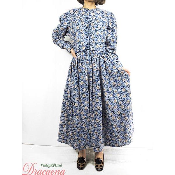 レディースワンピース古着 クラシカル ガーリー フラワー 花柄 紺 コーデュロイ 長袖 前開き aライン ワンピ ロング丈 古着 通販 ヴィンテージ古着屋のドラセナ