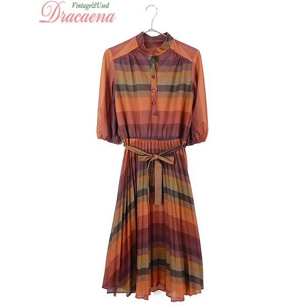 古着 レディース ワンピース 70s ボーダー 柄 赤 オレンジ ハイネック プリーツ レトロ クラシカル 七分袖 ロング ドレス 古着 30off 古着 通販 ヴィンテージ古着屋のドラセナ
