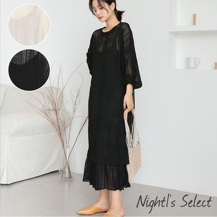 全2色 ワンピース クロシェ かぎ編み ミモレ丈 ざっくり 長袖 ラウンドネック ナチュラル レトロ カジュアル 大人可愛い ゆったり 上品 ユニーク デイリー 春 夏 like fashion powered by base