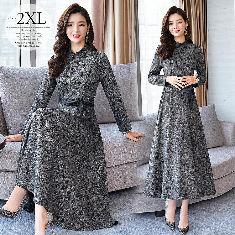シャツワンピース ロング 春 大きいサイズ グレー 長袖 大人ワンピース 通販 激安 レディース 大人 オープンカラータックフレアワンピース マキシ ワンピ お呼ばれ 二次会 上品 きれいめ