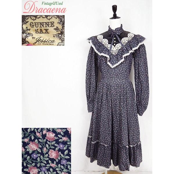 ワンピース古着 gunnesax ガニーサックス ガンネサックス レトロ クラシカル 小花柄 ネイビー系 フリル レース デザイン ハイネック 長袖 ワンピ ロング丈 17lde21d 古着屋ドラセナyahoo ショップ 通販 yahoo ショッピング