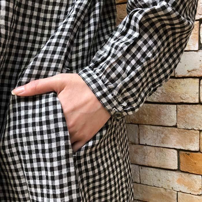 コットン リネンギンガムチェック長袖ワンピース s sk6008173 ブラック ホワイト