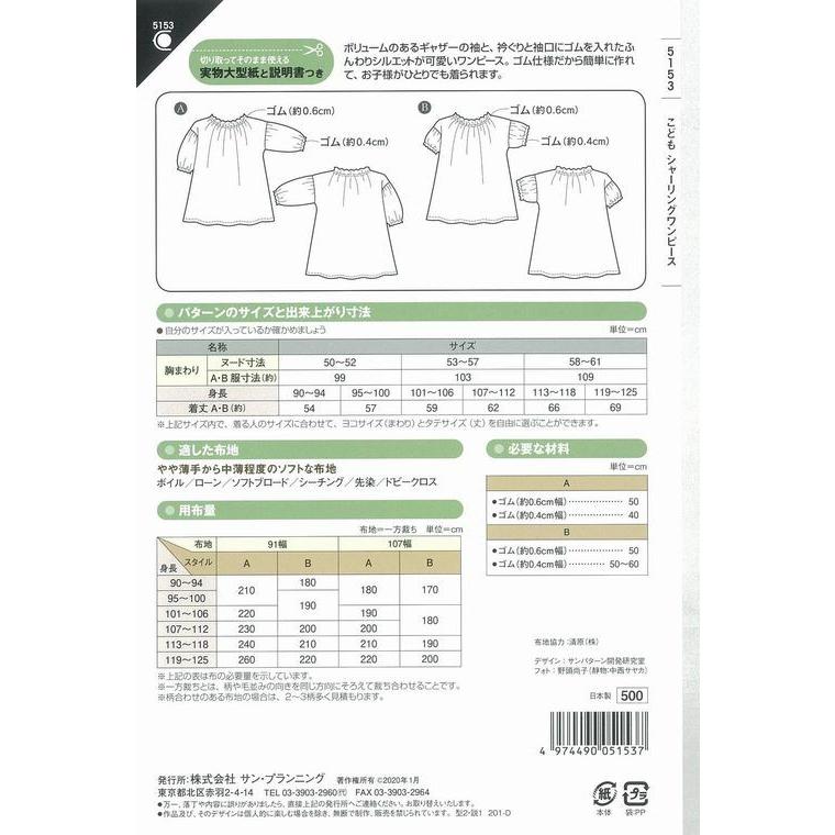 布 生地の販売 通販 takarabako fabrics k kids パターン 子供シャーリング キャミソール ワンピース サイズ100 110 120
