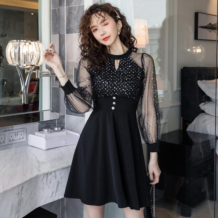 amazon fevon ワンピース レディース 長袖 春 秋 冬 ベルベット ブラック 無地 シンプル ドレス 女性 フォーマル チュール切り替え シースルー パール付き おしゃれ エレガント ワンピ スリム ふんわり 結婚式 宴会 パーディー ワンピース チュニック 通販