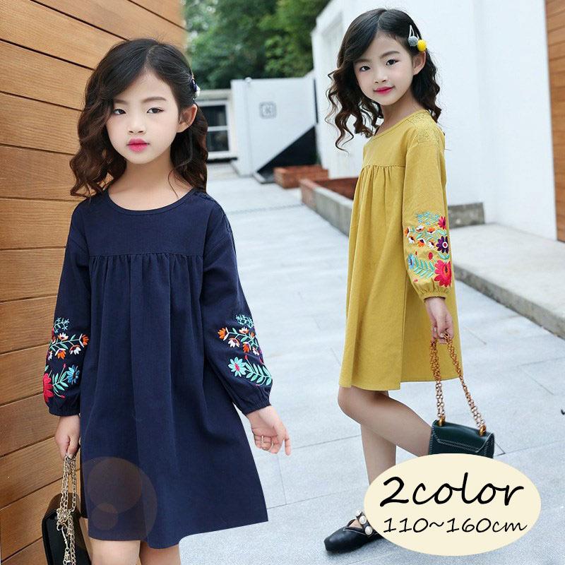ワンピース スモック キッズ ジュニア 女の子 フレア ラウンドネック 長袖 丸首 膝丈 ミニ ギャザー レース 刺繍 バックボタン 袖ゴム 花 フラ top 34541 おとりよせ com 通販 yahoo ショッピング
