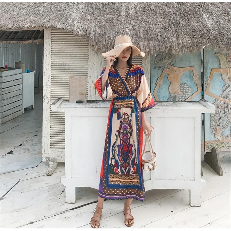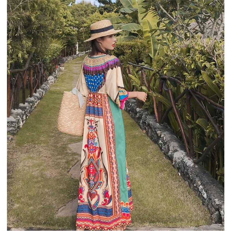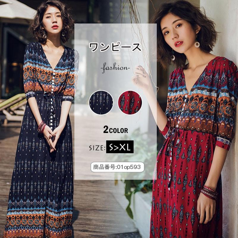 リゾートワンピース vネック ビーチ リゾート タイ 民族風 ロング丈 マキシワンピース 五分袖 ギャザー入り ウエストゴム 夏新作 エスニック 総柄 ワンピース chutn1902872 sssヤフーショップ 通販 yahoo ショッピング