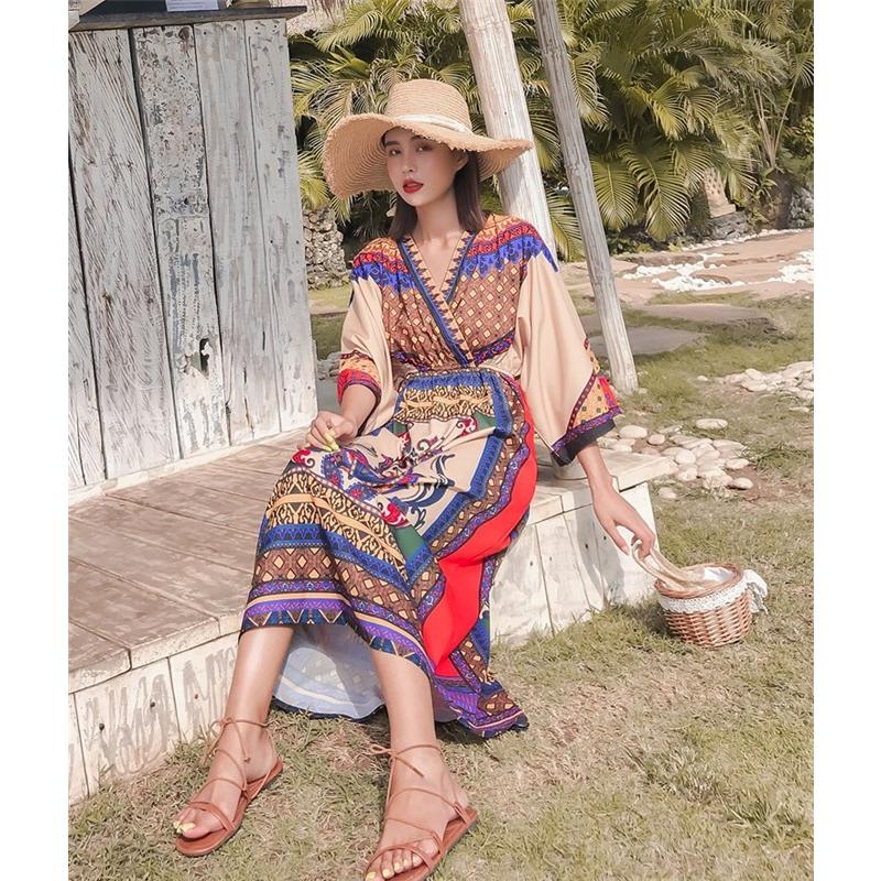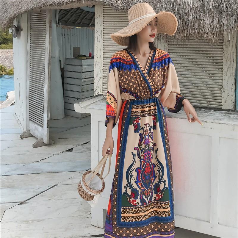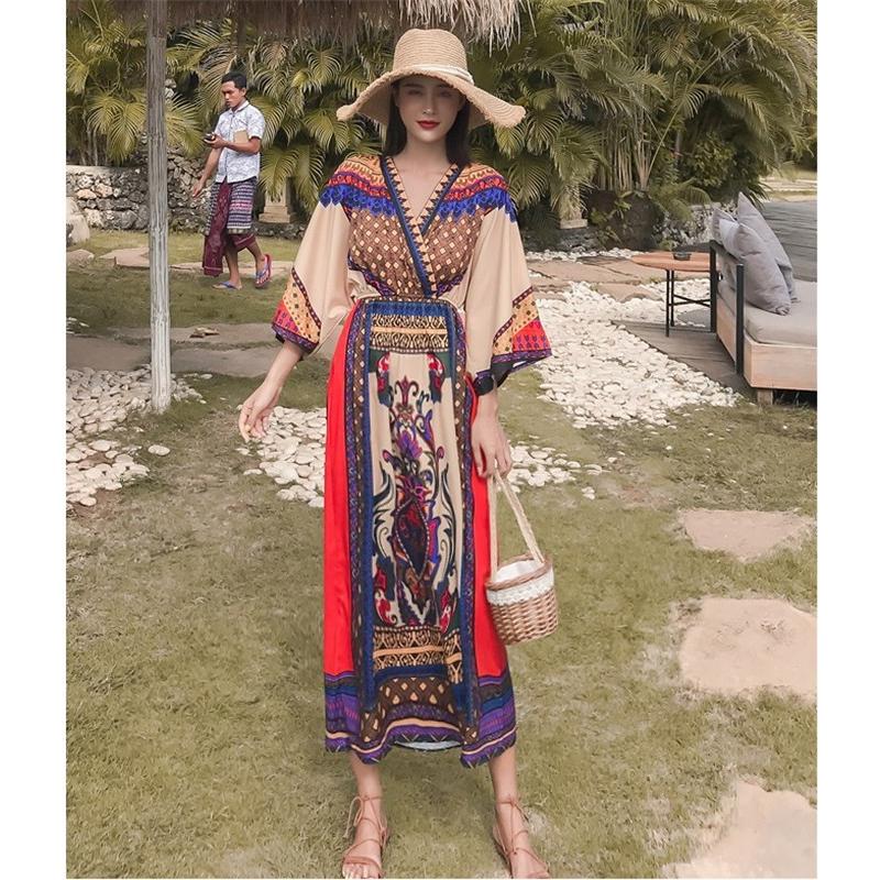 ワンピース エスニック風柄 出荷 華やか ボヘミア風 袖あり ロング丈 大人 カジュアル レディース 上品 エレガント 沖縄 タイ ビーチ ワンピー リゾート s マスクプレゼント中 夏服 夏物 オシャレ海 m l リゾート旅行 期間限定 夏 xl dk072l6l6d4