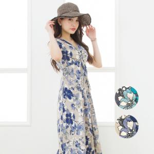 スクエアvネックのリネンロングワンピース yuwa花柄プリントターコイズブルー