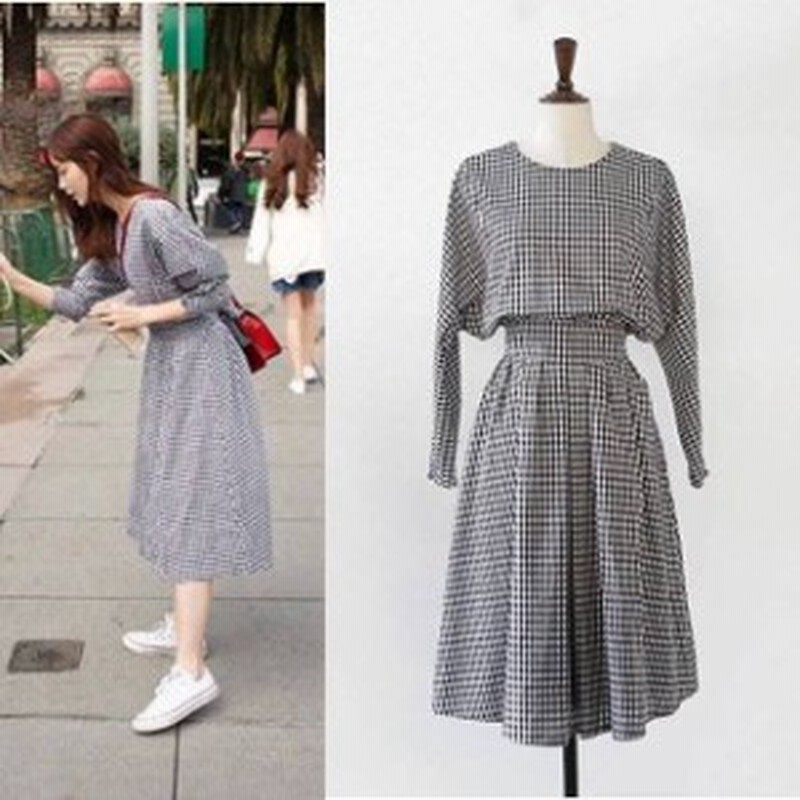 チェック ワンピース 韓国 ファッション レトロ ワンピース 長袖 可愛い aライン 春 n0023 cwショップ 通販 yahoo ショッピング