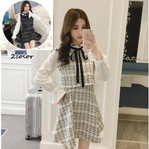 ツイードワンピース ミニ丈 体型カバー 長袖 チェック柄 ボウタイリボン レイヤード風 大人可愛い ガーリー カジュアル 韓国ファッション au pay マーケット