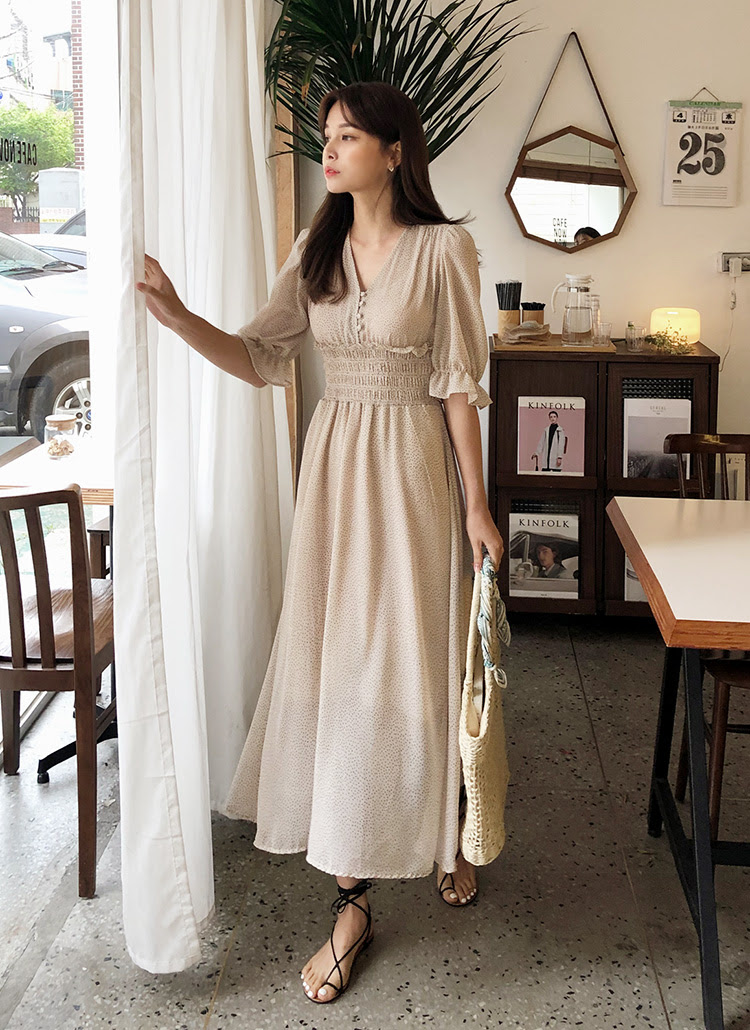 ドロストvネック柄ワンピース 全3色 b62548 レディース ops 韓国 ファッション ワンピース ロング ロングワンピース 長袖 vネック カシュクール ストリング シフォン フェミニン 上品 ベーシック シンプル カジュアル カジュアル 秋 冬