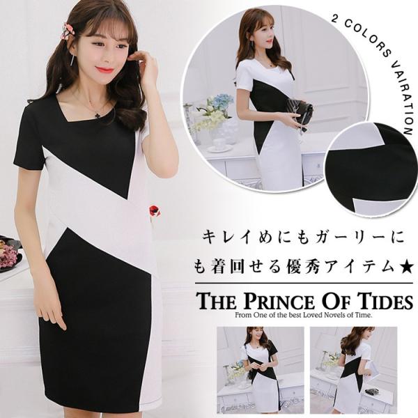 ポケット付きバイカラーaライン半袖ワンピース モノトーン ミニワンピ 大きいサイズ 結婚式 二次会 新作 160518 jsファッション 女子会 ファッションアイデア 半袖ドレス ファッション