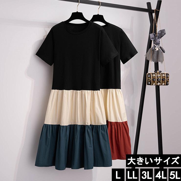 大きいサイズ レディース バイカラーワンピース アシメ 半袖ワンピ レイヤード l ll 3l 4l 5l ブラック 新入荷 ネコポス可 72453 queen