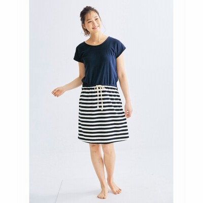 綿混パイル地ボーダーフレンチ袖ルームワンピース m パジャマ ルームウェア pajamas