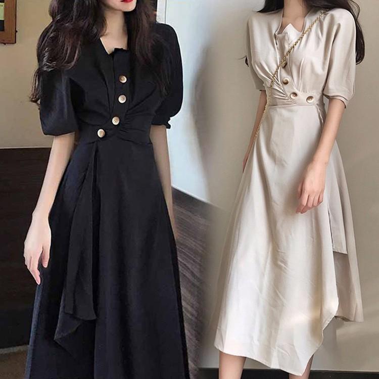 vネック ワンピース ミモレ丈 フロントボタン 黒 ワンピース レディース 春服 夏 ハイウエスト 袖あり 半袖 パフスリーブ ウエストマーク カジュアル きれいめ 20代 30代 40代 デート服 leap