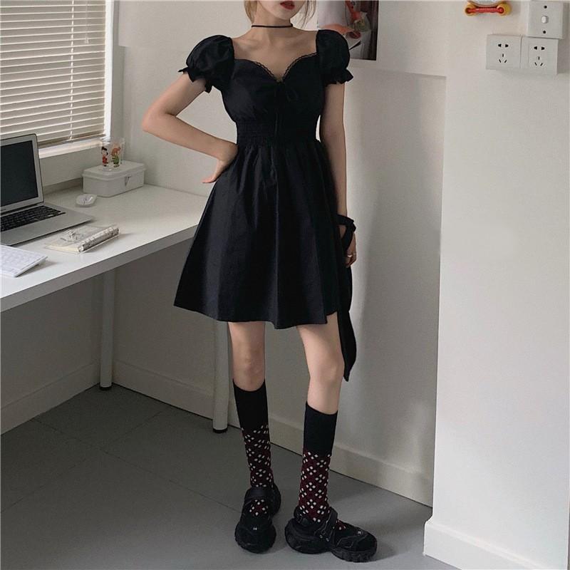 パフスリーブ ワンピース ドレス ミニ丈 半袖 aライン ロマンティック お呼ばれ パーティー レトロ ハイウエスト 無地 バックvネック aya1942 girl top powered by base