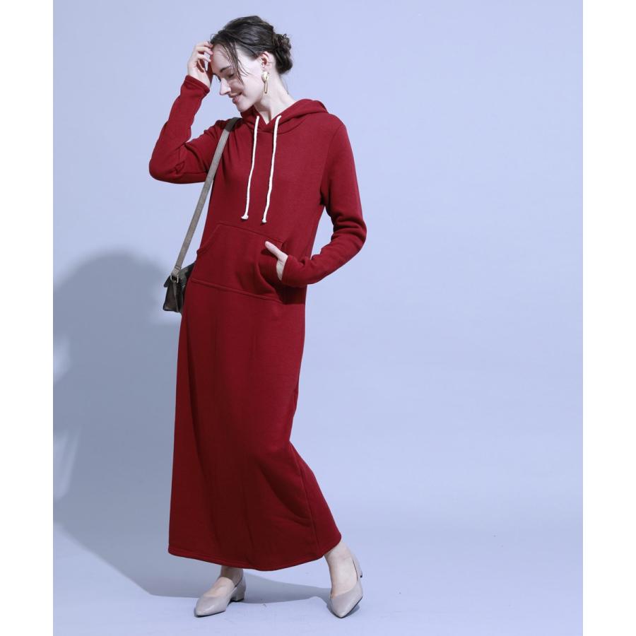 メール便不可 パーカーワンピース レディース 裏起毛 スウェット バルーンスリーブ 長袖 ロング丈 ミモレ丈 ポケット フード付き 20aw 26 200717001 03 木野園子さん フーディー ロングワンピース サイドスリット ストレート ゆったり ミディアム ミディ丈