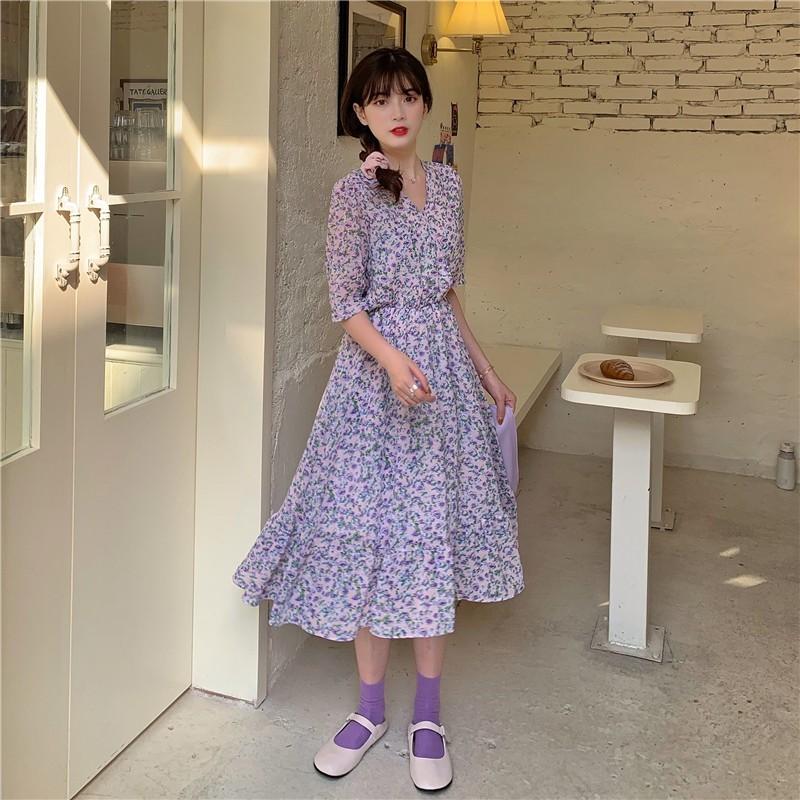 レトロ パープルフラワー ワンピース 花柄ワンピース vネック ひざ丈 ミディ丈 シフォンワンピース ワンピースドレス 春新作ワンピース 春ワンピース 夏ワンピース サマーワンピ フェミニン カジュアル ガーリー デート お出かけ 韓国 オルチャン 韓国ファッション 新作 春夏 春 夏 om 340