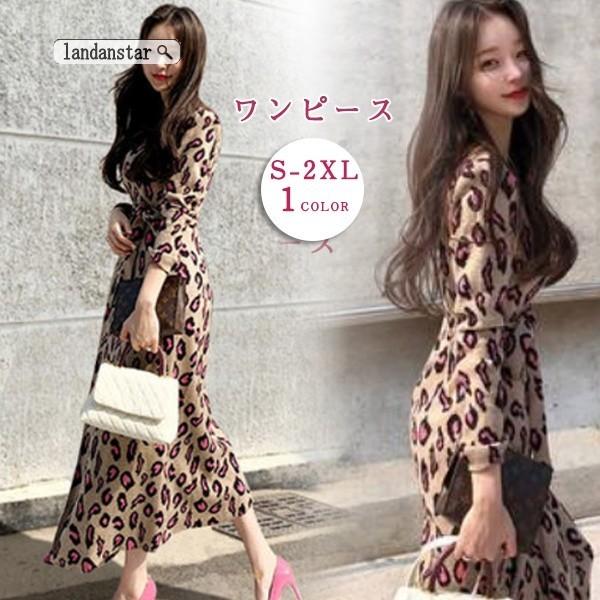 秋冬新作 ニットワンピース レオパードワンピース レオパード柄ワンピース ロングワンピース 大きいサイズ ヒョウ柄 vネック au pay マーケット