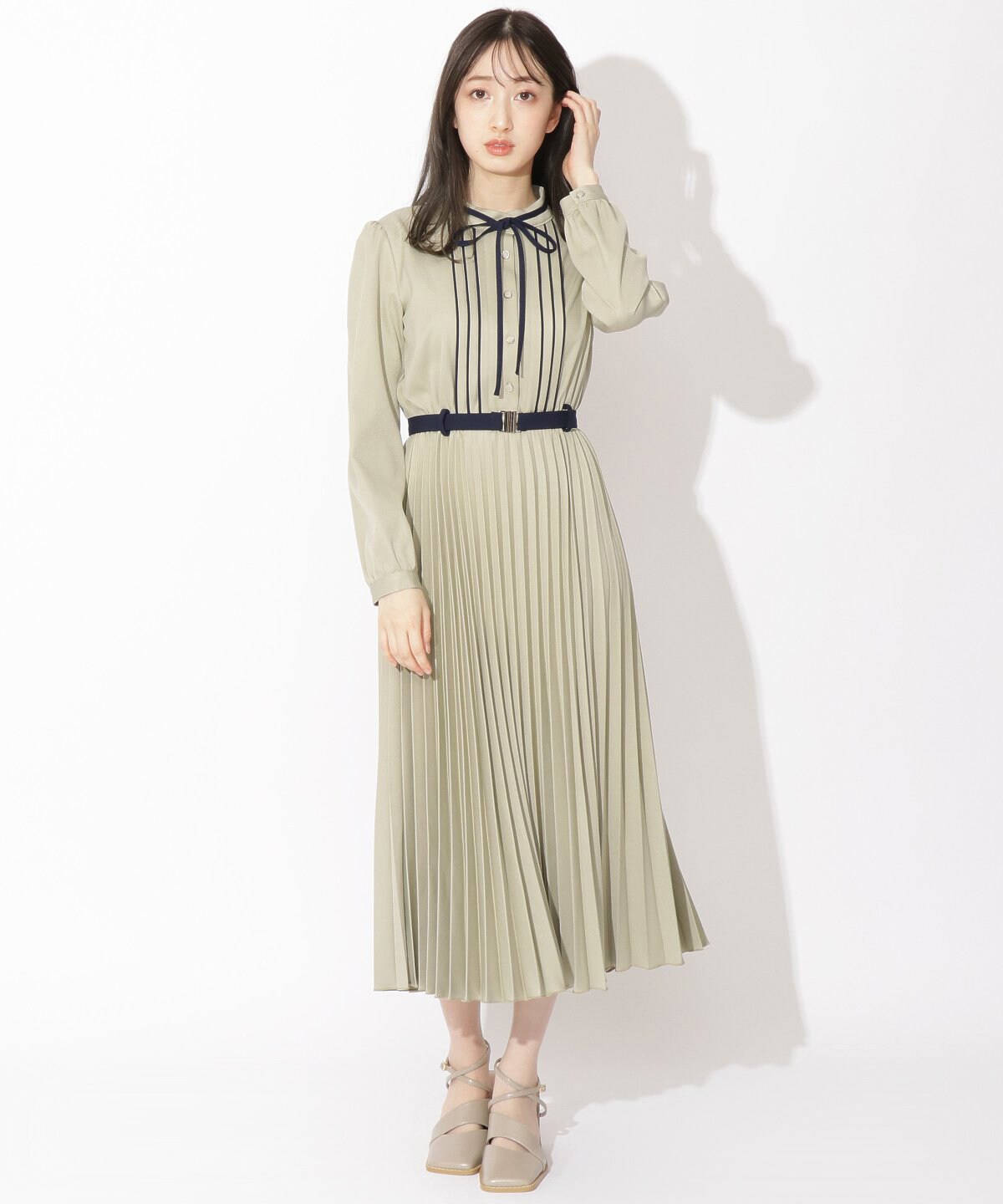 ベルト付スタンドカラープリーツワンピース