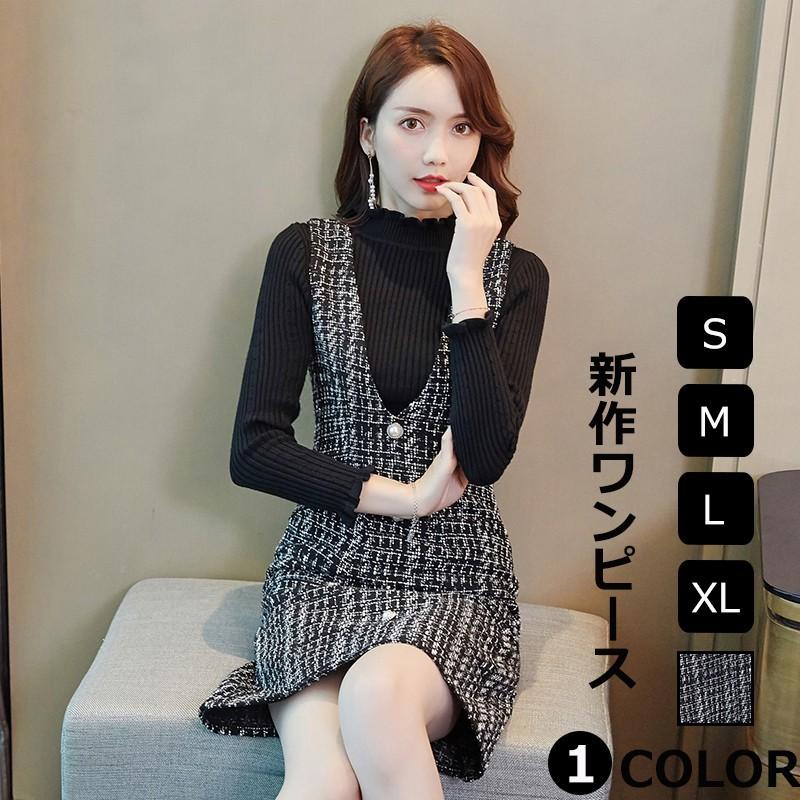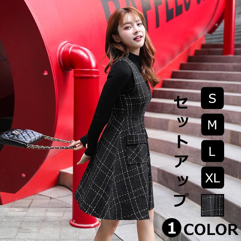 超安い 2点セット パーティードレス 膝丈ワンピース フォーマル エレガント 大きいサイズ 通勤 入園式 結婚式 卒業式 セットワンピース 2点セットタートルネックセーターハイネックセーターチェック柄ツイードワンピースベストワンピースロングジレ入学式 セット