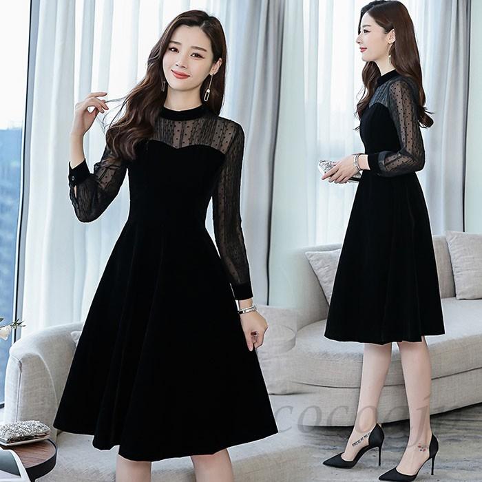 ベロア ワンピース ベルベットワンピース 袖シースルー シースルー長袖 レース ミニフレアワンピース 黒ワンピース 大人可愛い ワンピース オケージョンワンピース クラシカル 秋 冬 p6332 kirari きらり powered by base