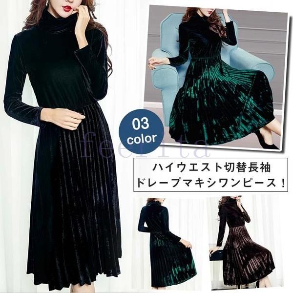 ハイウエスト切替長袖ドレープマキシワンピース ベロア生地ワンピース ワンピース ベロア ロングワンピース 長袖 aライン フレア パーティ z minana