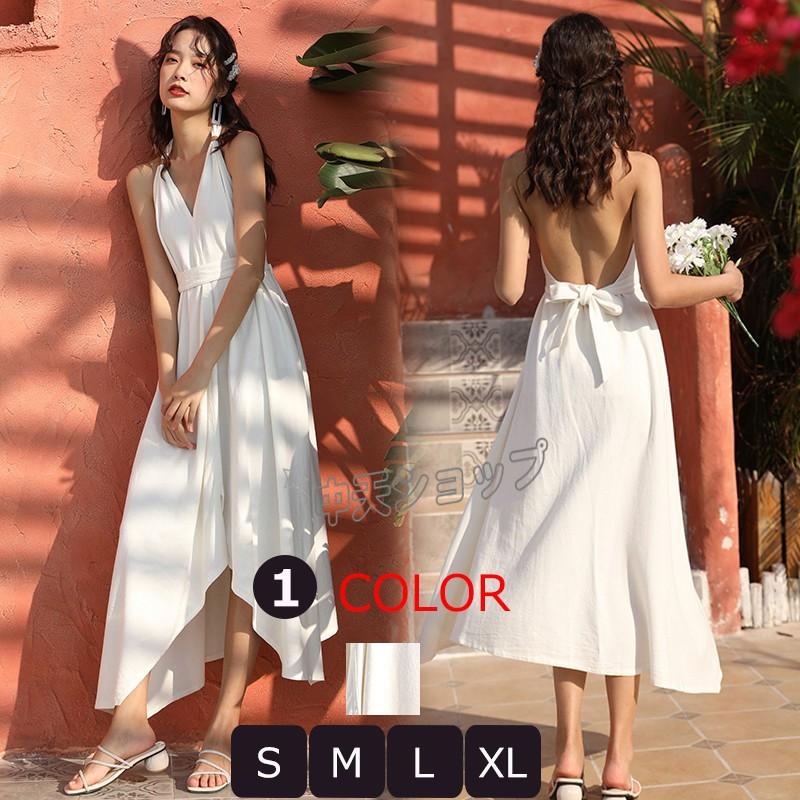 白ワンピース ホルターネック バックレス 夏物 着痩せ ホルターネックワンピース バックレスワンピース 無地 ロングワンピース aライン