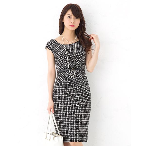 不二子ワンピ カーヴィーチェック モノトーンブラック opn040021 レディース ワンピース タイト 大人 夏 ジャージー ブラック 黒 上品 30代 40代 半袖 膝丈 エレガント チェック トールサイズ 大きいサイズ 通勤 オフィス fujiko フジコ mimi grant the