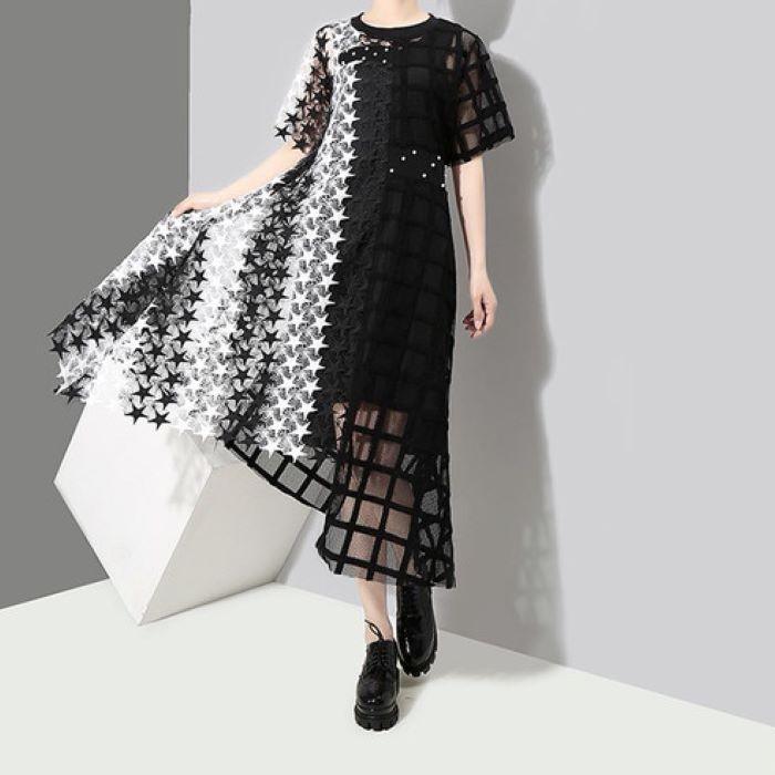大特価 ブラックxホワイト ステッチ パイピングトリム スタンドカラー アシンメトリーデザイン 長袖 ロングワンピース ミディワンピース モード 通販