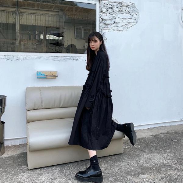 モード系 ブラック系 黒系 ゴシック モノトーン シャツワンピース ボリューム 長袖 ロング ギャザー おしゃれ