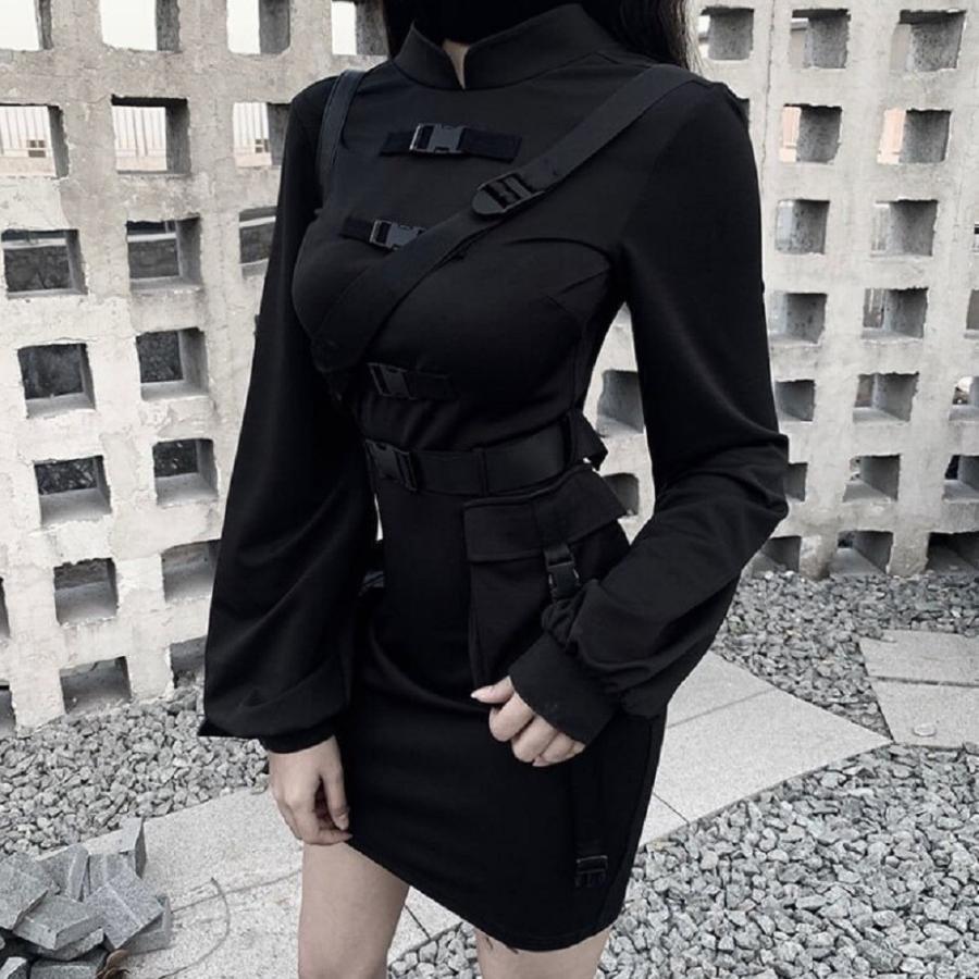 モード系 ワンピース ハイウエスト ウエスト紐 袖コン ゴシック 病み可愛い 大人きれいめ 通勤 黒コーデ 原宿系 20代 30代