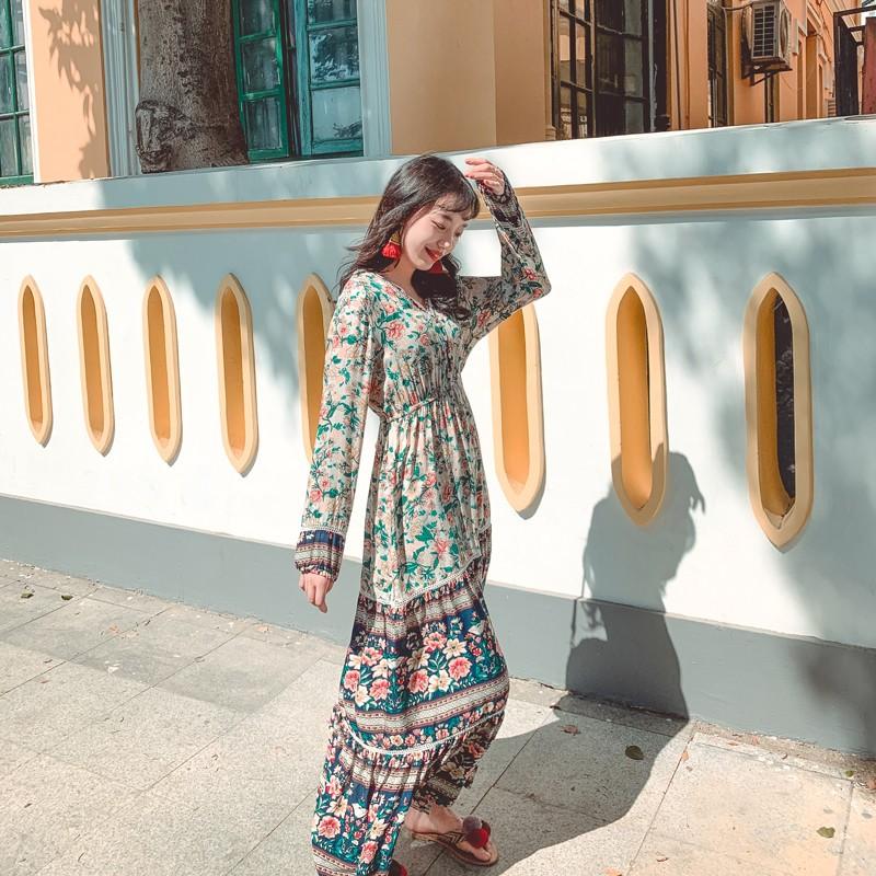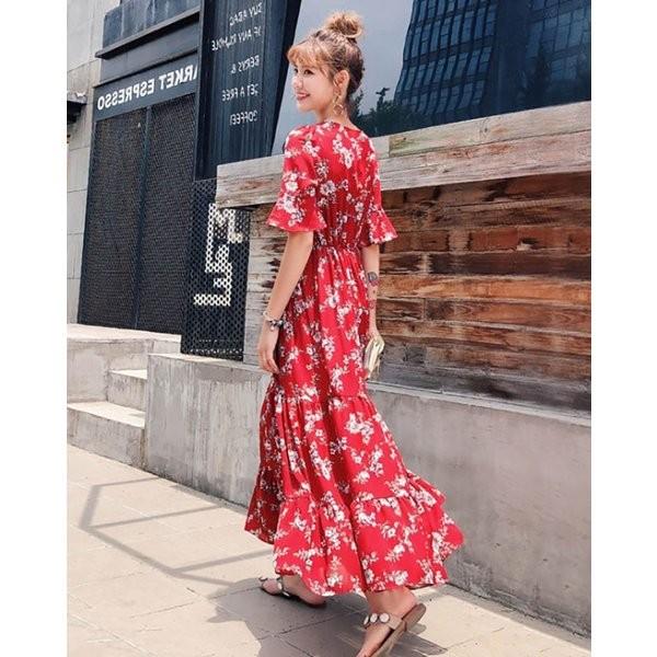 リゾート ロングワンピース 大きいサイズ レディース 長袖 ロング丈 プリント シャツ ワンピ 夏 新作 フェミニン リゾート ワンピ vネック リゾート ロングワンピ 大きいサイズ プリント ワンピ 韓国プチプラファッション専門店 leaflower リーフラワー