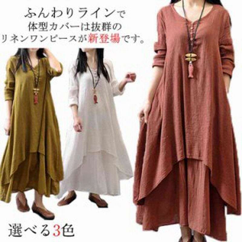 amazon elonglin レディース エスニック マキシ ワンピース レディース リネン ふんわり やわらか リラックス ワンピース 重ね着風 ロング カジュアル ワンピース 体型カバー 森ガール 無地 シンプル 長袖 春夏秋 全3色 m 5xl 大きいサイズ ワンピース