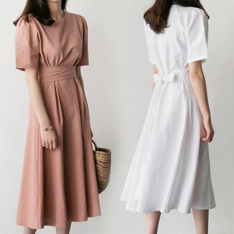 バックリボンワンピース ワンピースドレス ワンピース シンプル カジュアル 無地 半袖 パフスリーブ ミディ丈 韓国 オルチャン 韓国ファッション 新作 春夏 春 夏 ut 0684 musubi me 韓国 オルチャン レディースファッションのお店 powered by base