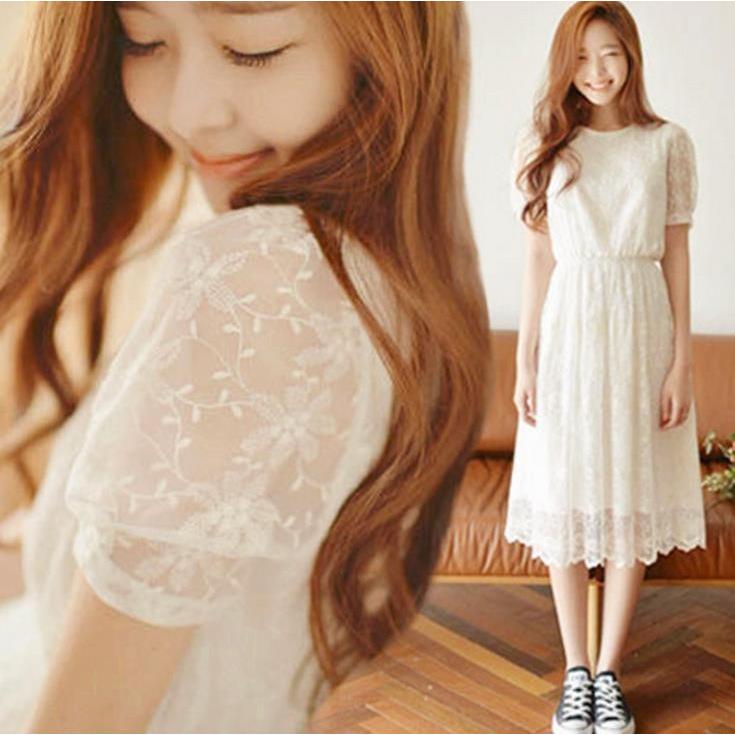 春の新作 ワンピース 白 ミモレ丈 森ガール 可愛い ワンピ 韓国風 レース レディースワンピース サマー 膝丈 姫様 5分袖 キャンパス系 ホワイト セール 激安の通販 価格比較のビカム