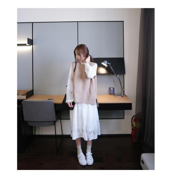 送料無料 セットアップ レディース 秋冬 カジュアル きれいめ ベストワンピース ジャンパースカート ドレス レース ウエストリボン ブラック 黒 ホワイト 白 重ね着 リブニット vネック 韓国 オルチャン 大きいサイズ xl 20代 30代 40代 50代