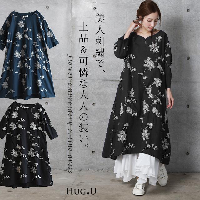 ワンピース レディース ロングワンピース 北欧 花柄 刺繍ワンピース 7分袖 コットン100 ワンピ ロングワンピ 膝下 お呼ばれ 春夏 w728 hug u ハグユー 通販 yahoo ショッピング