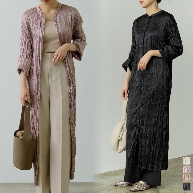 ニュアンスたっぷりのシワ加工で表情豊かに仕上げたシャツワンピsc m mtサイズ 低身長 高身長サイズ有 ワッシャー加工サテンバンドカラーシャツワンピース レディース ワンピース 無地 長袖 あす楽対応 re edit リエディ