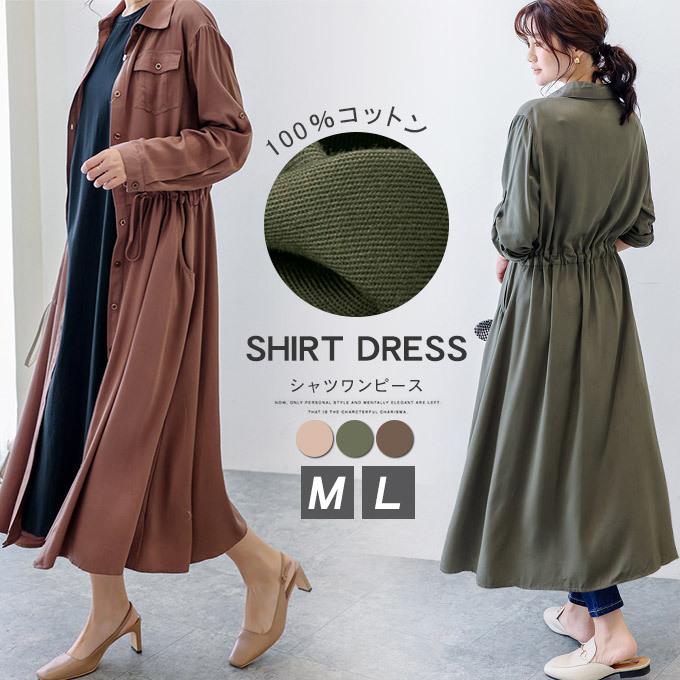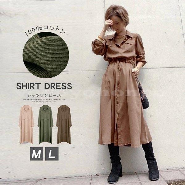 全3色 ロング丈 ワンピース アースカラー ラウンドネック ウエストリボン 長袖 グレー ブラウン カーキ 大人カジュアル ナチュラル 韓国 オルチャン ワンピ 春秋 秋冬 ol レディース like fashion プラス powered by base