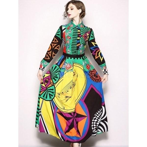 幾何学 総柄 マキシ ロングワンピース 主役級 幾何学模様 ワンピース カラフル レディース ヴィンテージ クラシカル 70年代