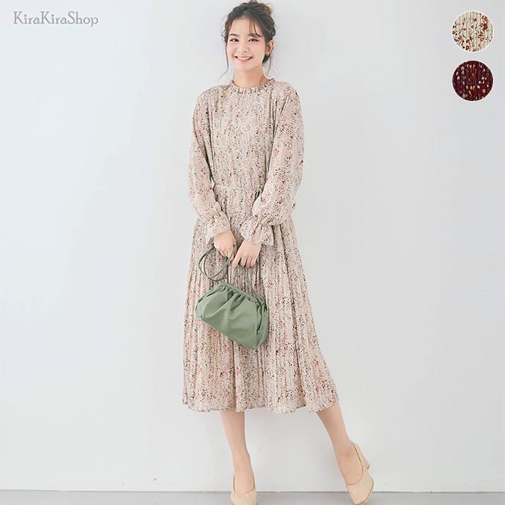 定番 ベーシックカラー ミモレ丈 シフォンワンピース シフォン ギャザー 長袖 ワンピース ロングワンピ ボリューム袖 パフスリーブ 小花柄 レトロ調 ハイウエストフレア プリーツワンピ mistral powered by base