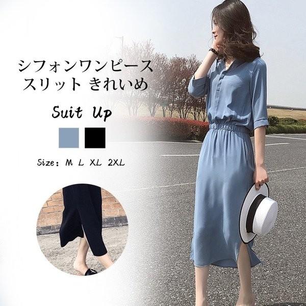 ワンピースレディース夏シフォンワンピース五分袖ロングワンピース30代40代スリット入れシャツワンピース体型カバー大きいサイズ夏ワンピ着痩せ