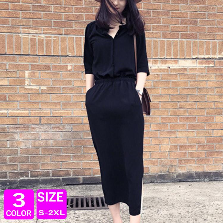 ワンピース ロング シャツワンピース レディース 体型カバー 黒 マキシワンピース 五分袖 スリット入れ 着痩せ 春ワンピース 夏 マキシワンピ bau167 vivishow 通販 yahoo ショッピング