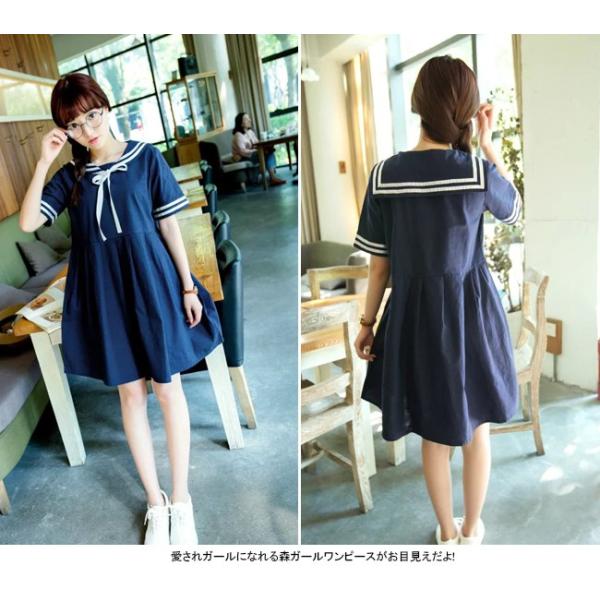 森ガール ワンピース セーラー襟 セーラー風 半袖 ワンピ リボン 学生 制服 春 セーラーワンピース 夏 白ライン aライン ひざ丈 3 rimfool powered by base