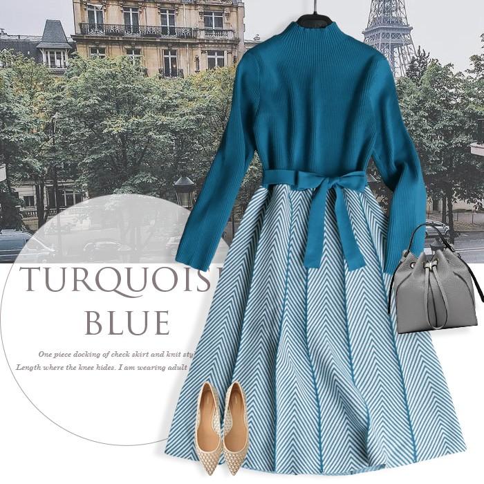 圧縮ウールニット ターコイズブルーゆったりハイネック ワンピース